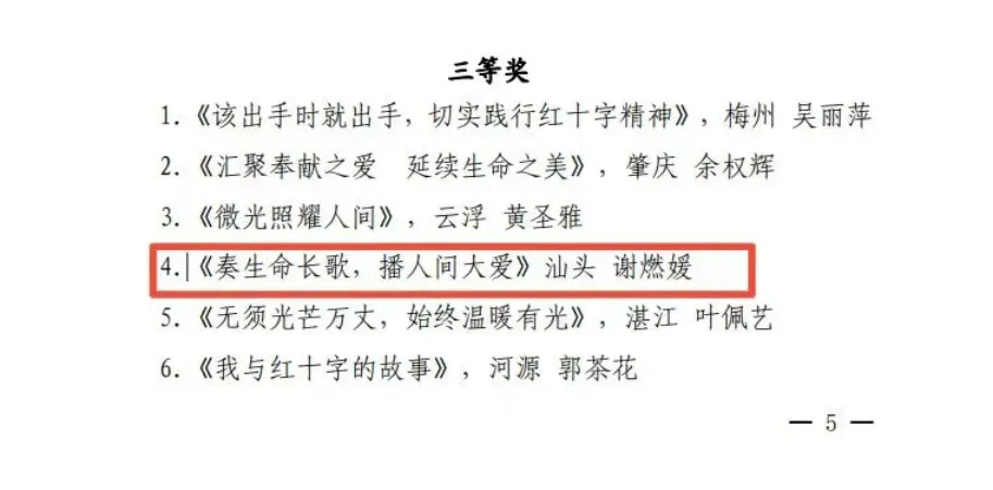 近日,广东省红十字会公布2024年广东省红十字系统第七届 “坚定跟党走,建功红十字” 征文比赛获奖名单🙅🏻‍♂️🍸,我校学子23级传策3班谢燃媛的作品《奏生命长歌,播人间大爱》在该比赛中荣获三等奖,为学校争得荣誉。