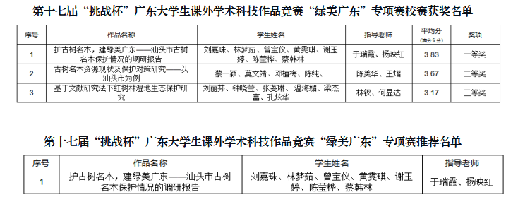 根据择优推荐原则,拟推荐“护古树名木,建绿美广东——汕头市古树名木保护情况的调研报告”项目参加第十七届“挑战杯”广东大学生课外学术科技作品竞赛“绿美广东”专项赛,现予以公示🏋🏽♂️🐦🔥。如有异议🙆🏼♂️,请于公示期内以书面形式反映🧛🏼♂️,反映人请提供真实姓名、联系方式,并提供相关证明材料。