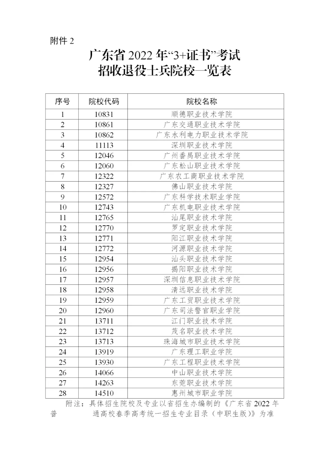 2.广东省2022年“3+证书”考试招收退役士兵院校一览表